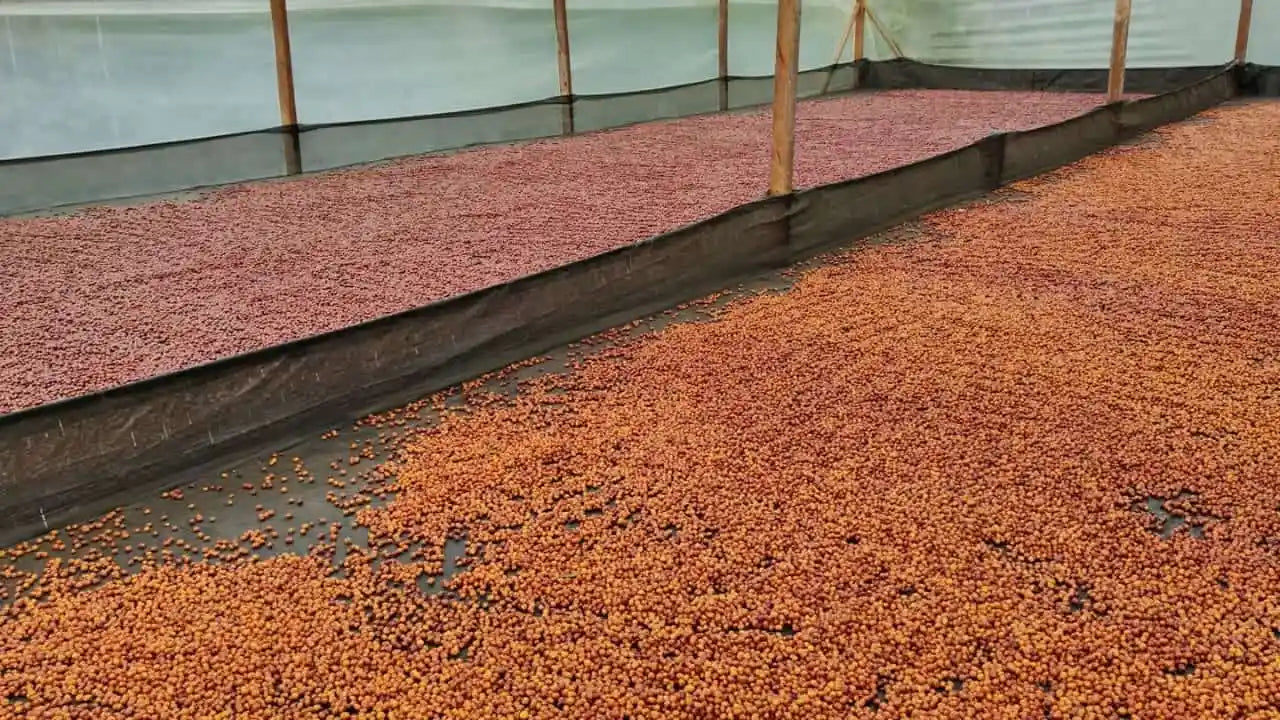 This particular lot of coffee has been popped through several phases of processing including 48hrs of fermentation in aerobic recirculating tanks that pump the must (coffee juice) back over the top of the fermenting cherries as it breaks out, monitoring for brix and ph level constantly. It is then floated, with faults removed, before being washed in 50*c water to kickstart a new fermentation with cultured yeasts and sealed in anoxic tanks at 32*c for approx 38 hours. It is mechanically dried afterwards to bring the moisture level down around 18%, then transferred to sealed bags to homogenize over 2 days before being finished traditionally down to the target 10-12% in shaded marquesinas.